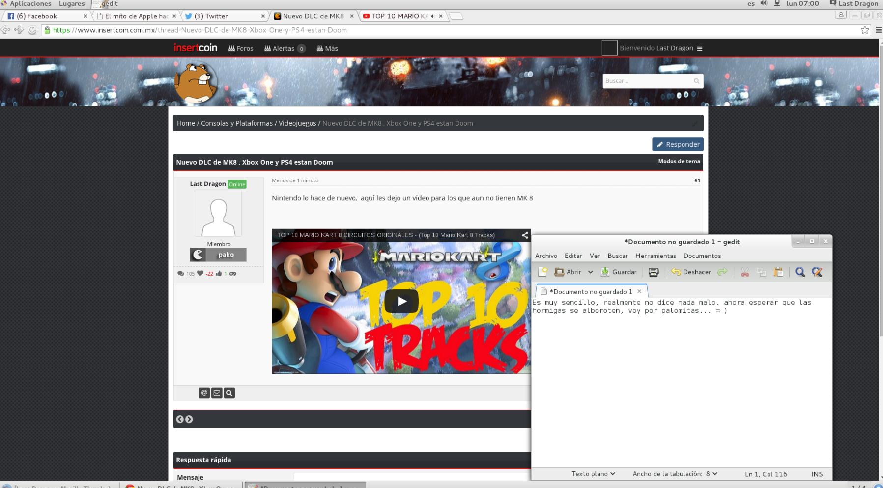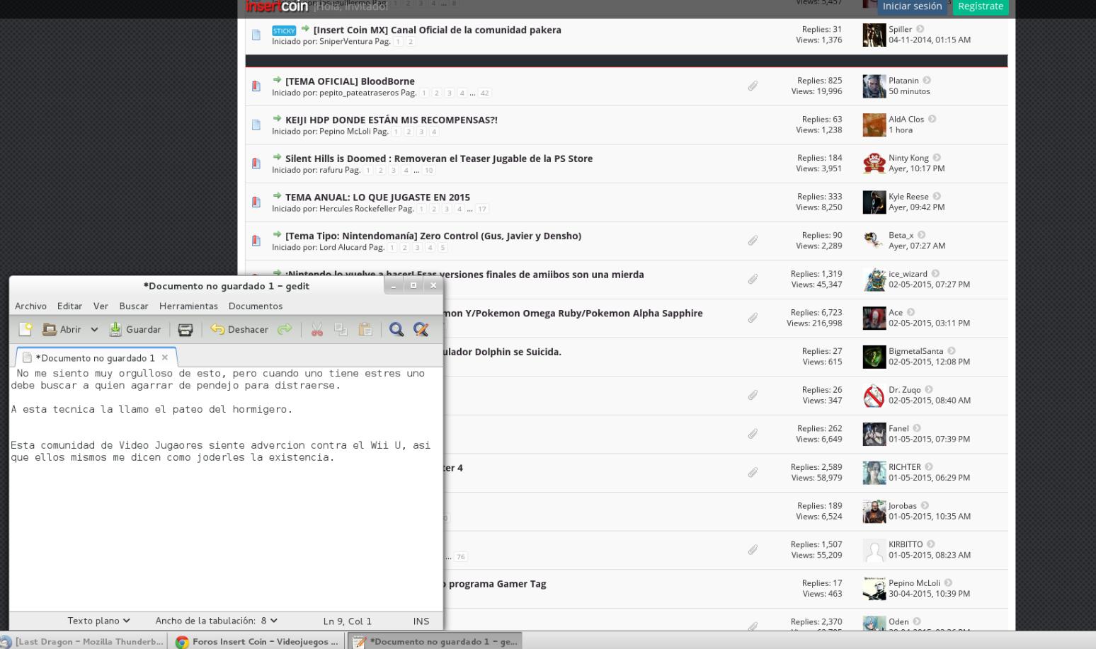 Ahora cada vez que tengo un día estresante voy al foro, escribo una frase que incluya alguna franquicia de Nintendo, caliento unas palomitas y a disfrutar. Son predecibles como la mosca a la miel, me los imagino como un hormiguero tranquilo hasta que llego a patearlo, todos se alborotan, es muy divertido.