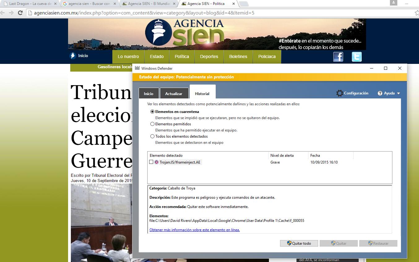 En ciudad del Carmen, estado de Campeche es un sitio de internet muy conocido, por lo que es ideal para infectar a miles de visitantes que entran a leer noticias. Por un tiempo no deberías entrar al sitio web de www.agenciasien.com.mx, ya que los responsables del sitio han tardado mucho en reaccionar ante este hackeo y cada que alguien lee una noticia resulta infectado. En esta imagen queda el intento de infección a la computadora que use para visitar el sitio después del hackeo.