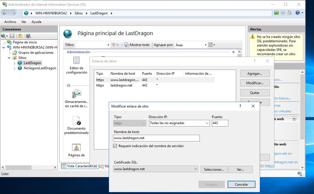 Una vez importado el archivo PFX en enlaces como se dijo anteriormente puedes seleccionar si tu sitio usara SSL, ahora si puedes seleccionar HTTPS y te dará una lista de certificados disponibles para tu dominio. Selecciona el correcto y ahora ya tienes seguridad SSL
