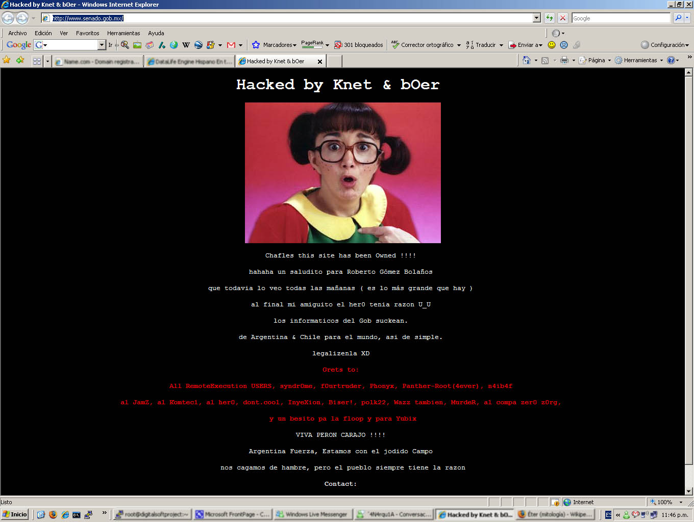 Anotación (segundo intento): El deface anterior fue a la web de la Cámara de Diputados. De acuerdo a El Universal, es la primera ocasión que la web de la Cámara de Senadores sufre un deface (la de Diputados ni hablar, ya ha sido alterada varias veces)