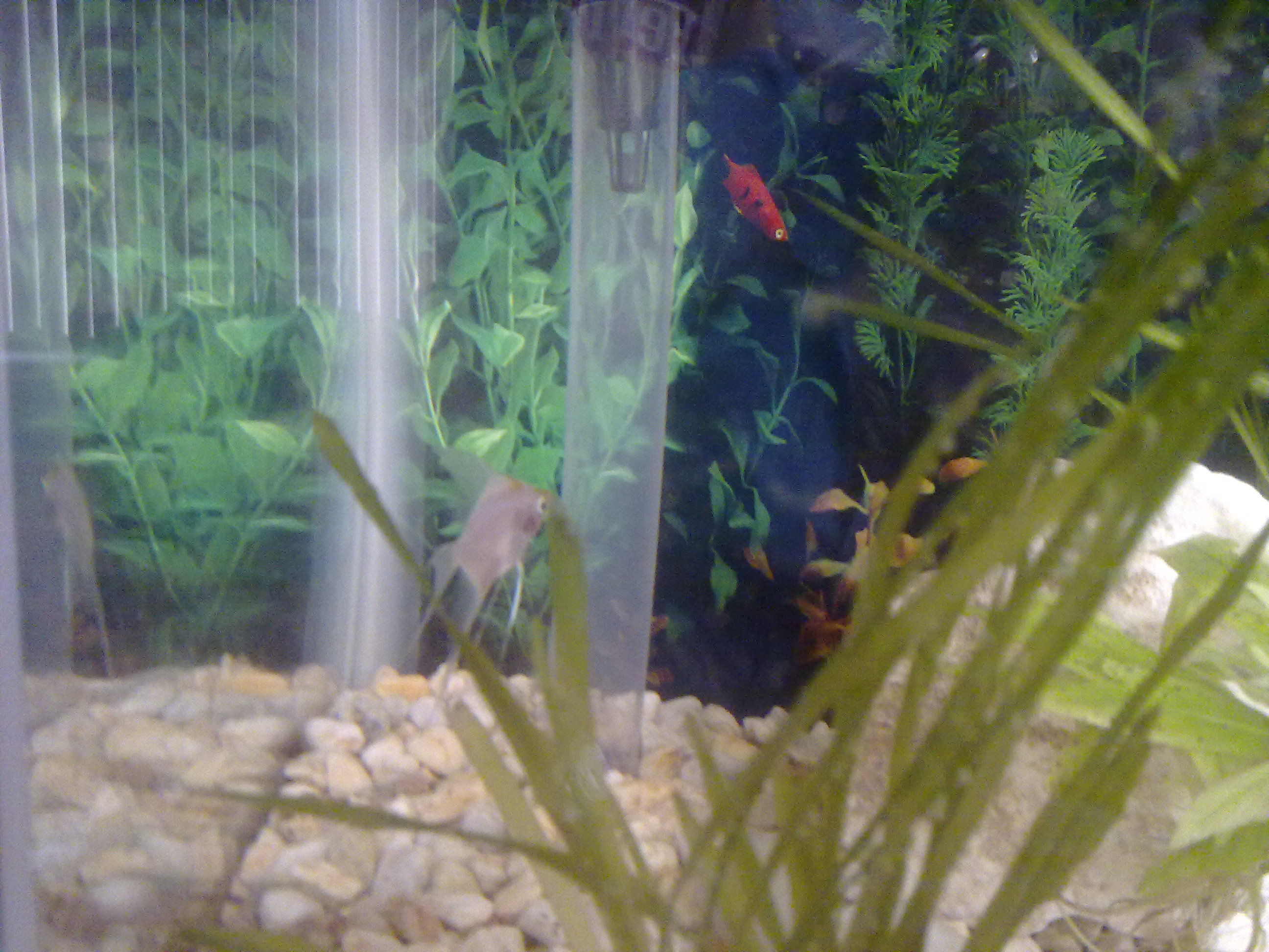 siguen vivos, sobre el agua, era madura, el agua la saque del mismo acuario, aun asi tengo ya todo lo necesario para madurar agua en caso de que alguna vez tenga que cambiarla toda