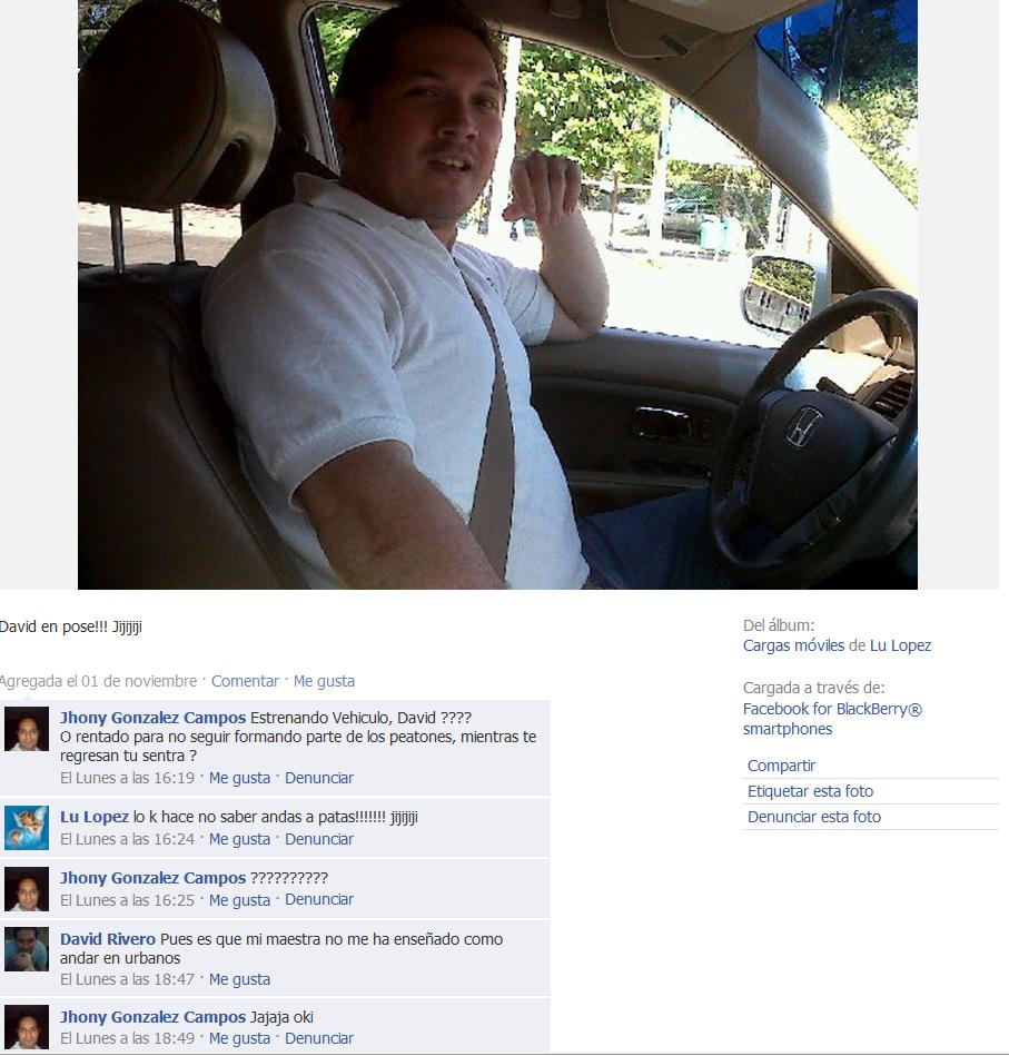 Oye ya en serio porque no vas a Alburqueque y lo “arreglas” personalmente, con respecto a lo de tu carro a todos nos ha pasado en esta Isla jeje, pero no por eso vas a tirar aceite enseñando fotos de tu Pilot, esta de weba eso, sobre todo que aqui en Carmen ya sabes como se maneja la vida SOCIAL. en pocas palabras te ves bien wannabe David, no seas asi.