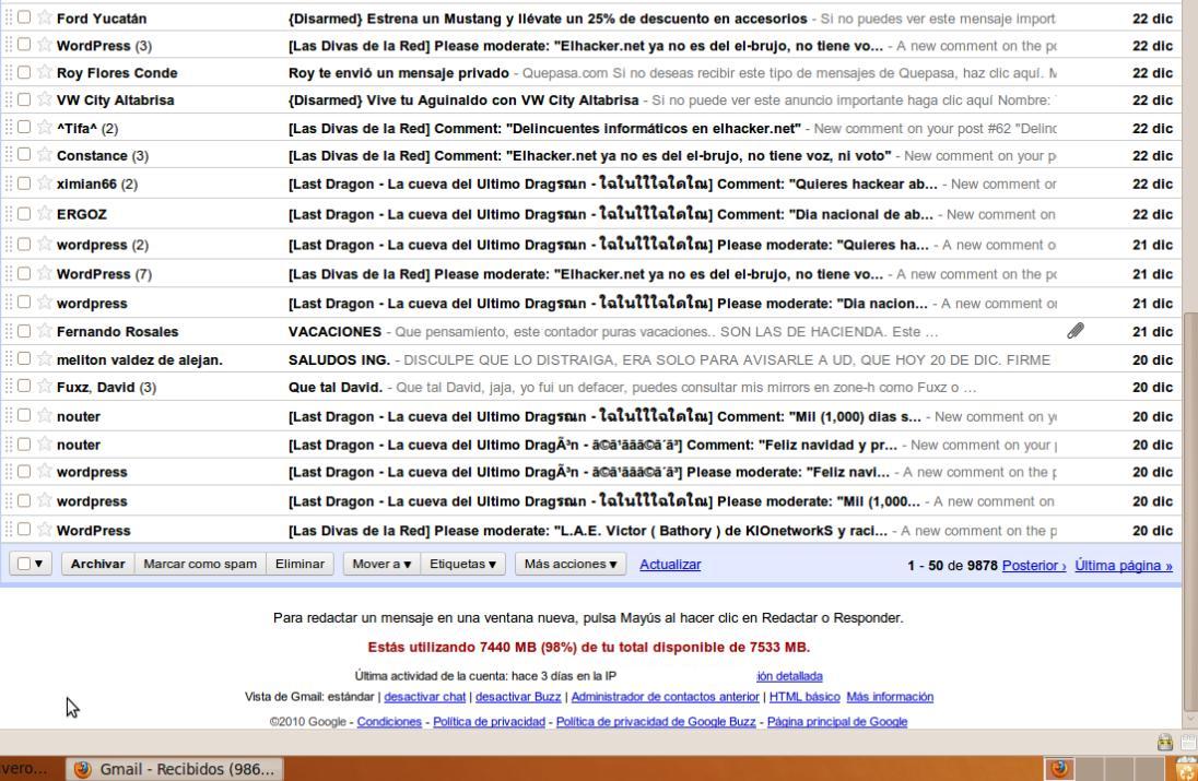 El propósito banal es cumplir con el banal del 2010, el cual era simplemente dejar de borrar correos electrónicos y demostrar que con un año intensivo de uso el Gmail se agota, me fallaron los cálculos o me dieron mas espacio lo que haya ocurrido primero, por que me hacen falta unos días mas pero seguramente pasando el año para saturar el buzón.