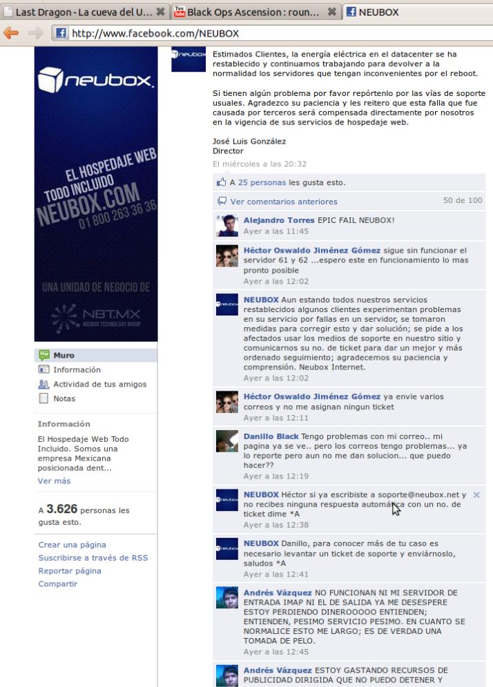 Ciértamente el servicio de Neubox, dirigida por Jose Luis Gonzalez Rodríguez es pésimo, pero eso se debe a que lo barato sale caro. Revenden servicios de terceros y por ello cuando algo pasa no pueden hacer nada hasta que el proveedor real lo arregle. Para ofrecer servicios baratos obviamente compran servicios muy básicos en un Centro de Datos de tercera (el cual por lo visto no tiene ni siquiera red eléctrica redundante)