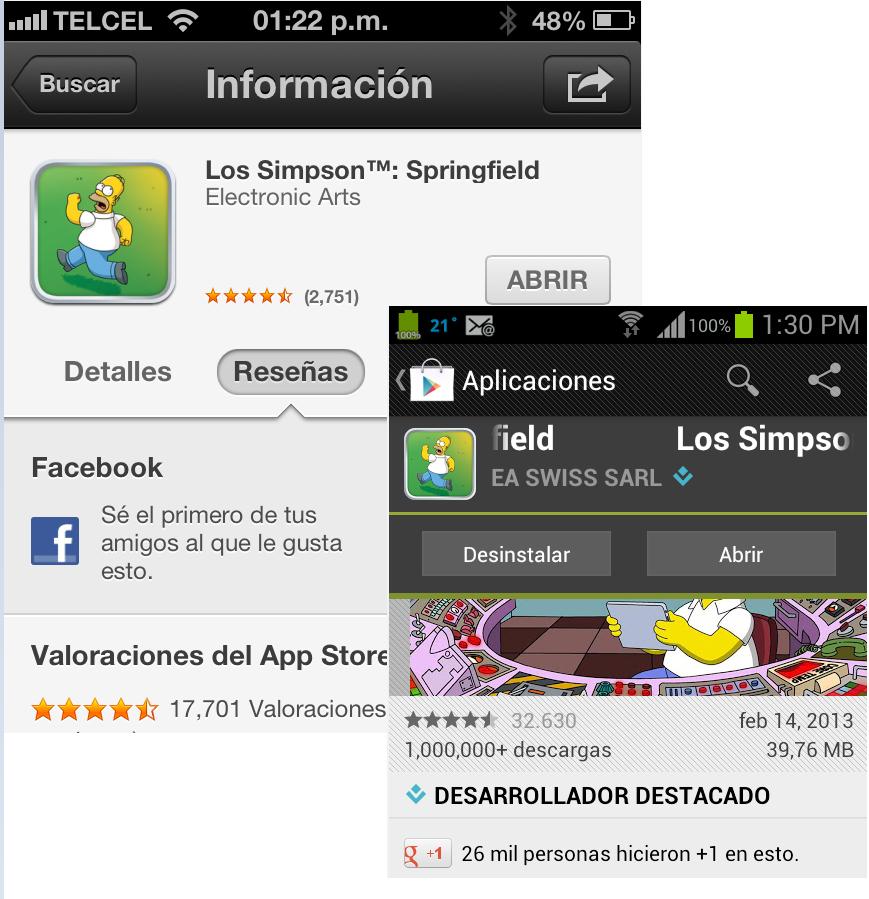 Hace una semana me dicen que si ya había bajado el juego de los Simpson Springfield en Android que estaba buenísimo. Volví a revisar la GooglePlay y ahí estaba. Unos dicen que salió el 7 de Febrero, otros el 14 de Febrero da igual, salió en Febrero del 2013 para Android. Pero note algo que me llamo la atención, mientras lo descargaba vi los reviews y vi un numero espectacular, mas alto al que había visto en mi Iphone. Luego vi las descargas y decía 500,000+ obviamente más del medio millón de descargas. Al día siguiente volví a revisar el review y decía 1,000,000+