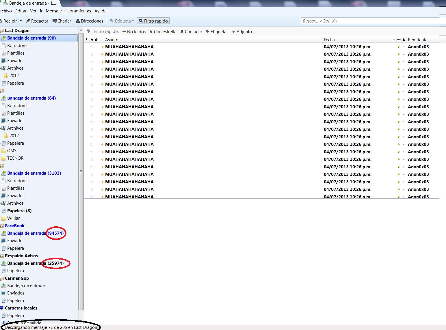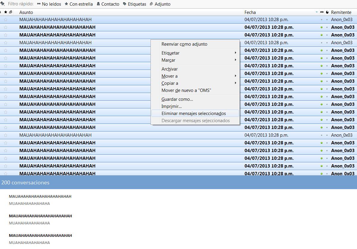 Todo se me hizo muy gracioso un niño jugando al hacker, pero me llamo la atención la parte que dice. “ Mas de 1,000 Emails directo a tu bandeja de entrada “, cuando leí eso una sonrisa se me dibujo en los labios y pensé “Ay tenurita” me transporto 1995, si a 1995, recuerdos de programas como el MailBomber llegaron a mi mente y no sabía si la sonrisa era de ternura por este niño o por los recuerdos de épocas más inocentes en el internet, fui a buscar los MAS de 1,000 correos a mi bandeja de entrada y me encontré que la mi servidor “ La cueva del Dragón “ que tiene analizadores bayesianos tan solo como la primera defensa de mi correo, vi llegar unos tímidos 200 correos electrónicos. Pensé, alguien le tiene que decir a esta ternurita de niño que ya no estamos en 1995, en 1995 su ingenuo ataque habría sido impresionante pero en el 2013 se ha auto humillado jugando al hacker.