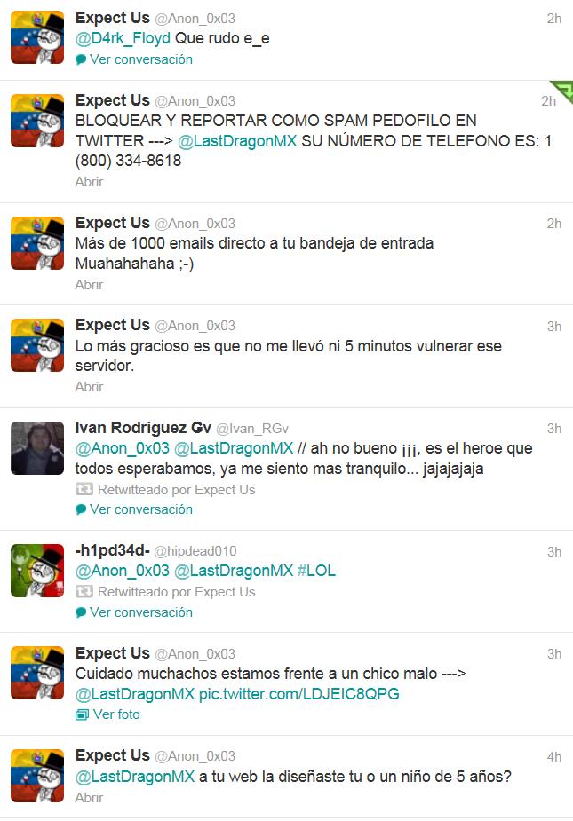 Mi reacción inicial fue decirle por Twitter si creía que era divertido atacar esas páginas de gobierno y la reacción fue explosiva. Me hizo un meme de que soy un héroe, el cual se me hizo tan gracioso que si no mal recuerdo le di RT. Se puso muy pesado el niño, pienso que es un niño por las reacciones que tiene. Un adulto maduro no expresa las cosas de esa forma.